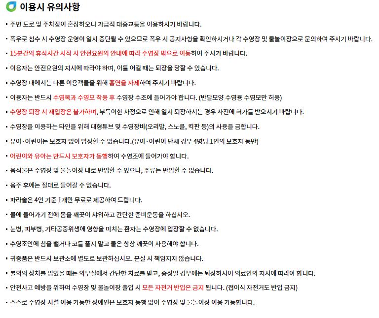 - 안전 수칙 : 물에 들어가기 전 샤워 및 준비운동 필수